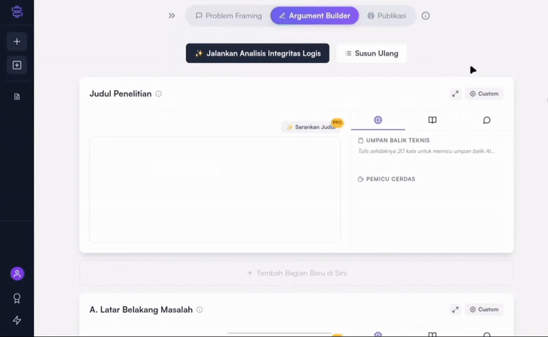 Setiap riset itu unik. Susun ulang, tambah, atau sembunyikan bagian proposal sesuai kebutuhan spesifik penelitian Anda. Anda yang memegang kendali penuh.